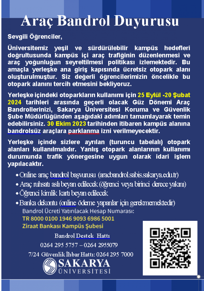 Not: Bandroller dönemlik verilmekte olup güz dönemi için 25 Eylül tarihi İtibari ile yenilenecektir. Bahar dönemi ise 20 Şubat 2024 tarihi itibari ile yenilenecektir. Bandrolünün başka bir kişiye verilmesi ve çoğaltılması durumunda ilgili kişinin bandrolü iptal edilerek hakkında gerekli işlemler başlatılacaktır. Aracınızı satmanız halinde bandrolün araçtan sökülerek Güvenlik Şube Müdürlüğüne teslim edilmesi gerekmektedir..